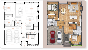 2D floor plans are now essential features in the real estate market. Present customers with a professional floorplan, showcasing house layout with textured floor and furniture.